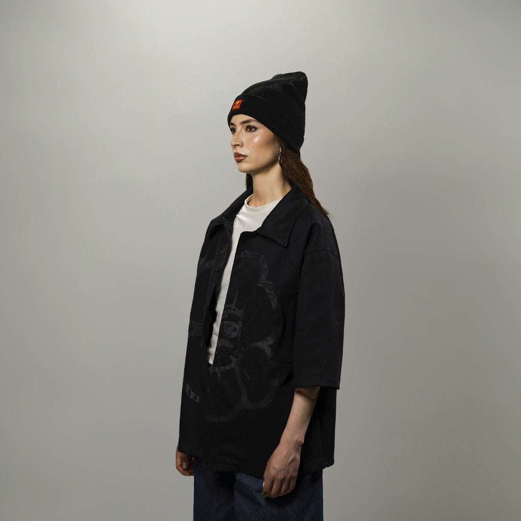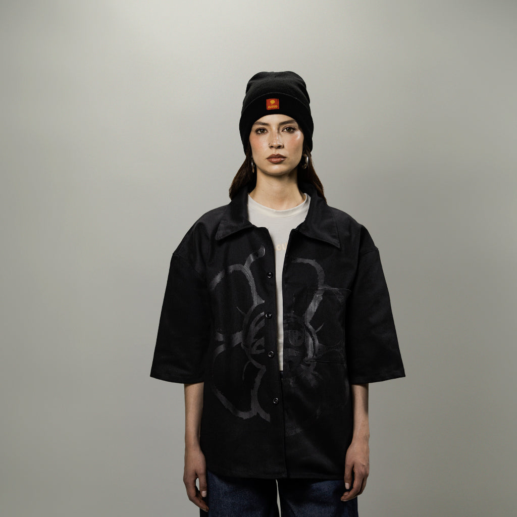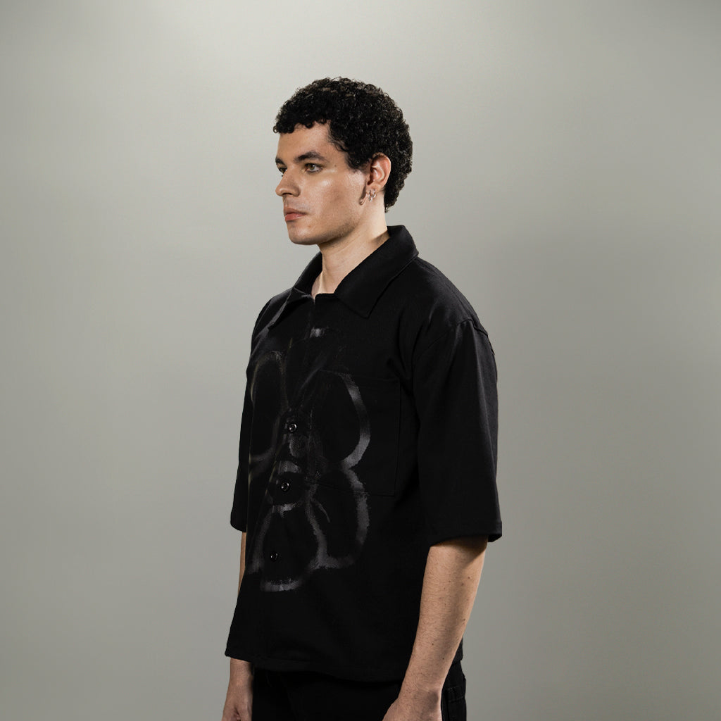 Camisa de botones gris en horma boxy fit estampada en serigrafía plana a un tono en Bogotá Colombia. Arte por @_johener_