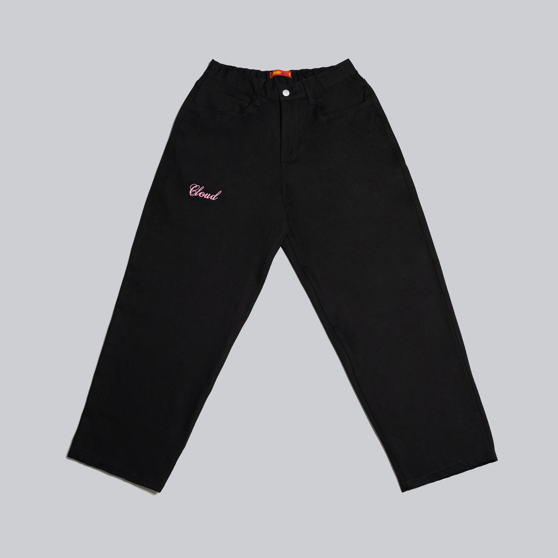 Pantalón en Denim negro con bordado rosado. Horma baggy 100% algodón.