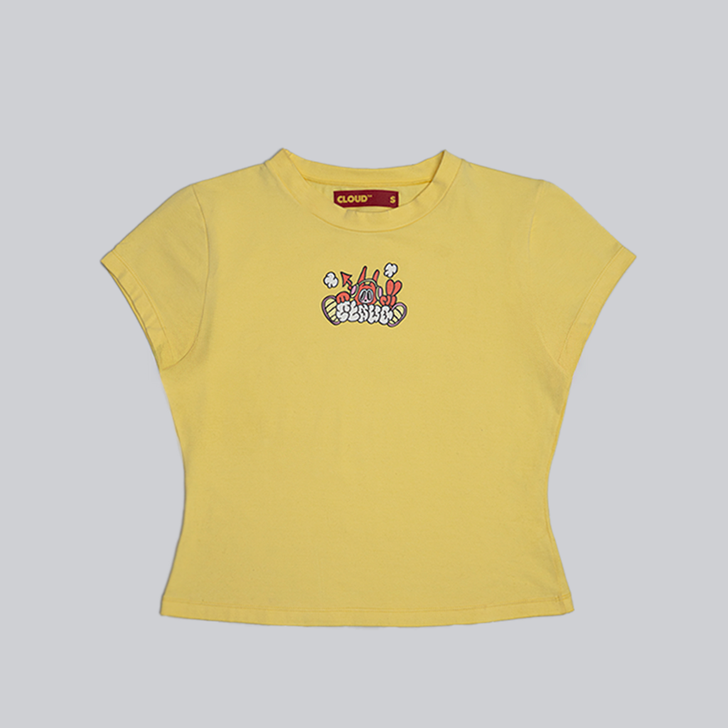 Baby Tee de color amarillo 93% algodón y 7% spandex, estampada con arte de @chaoantonia en serigrafía plana en Bogotá, Colombia.