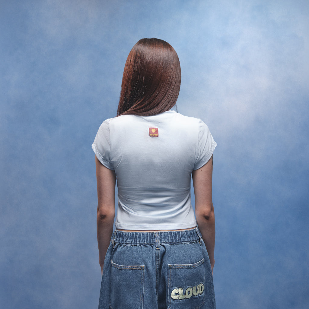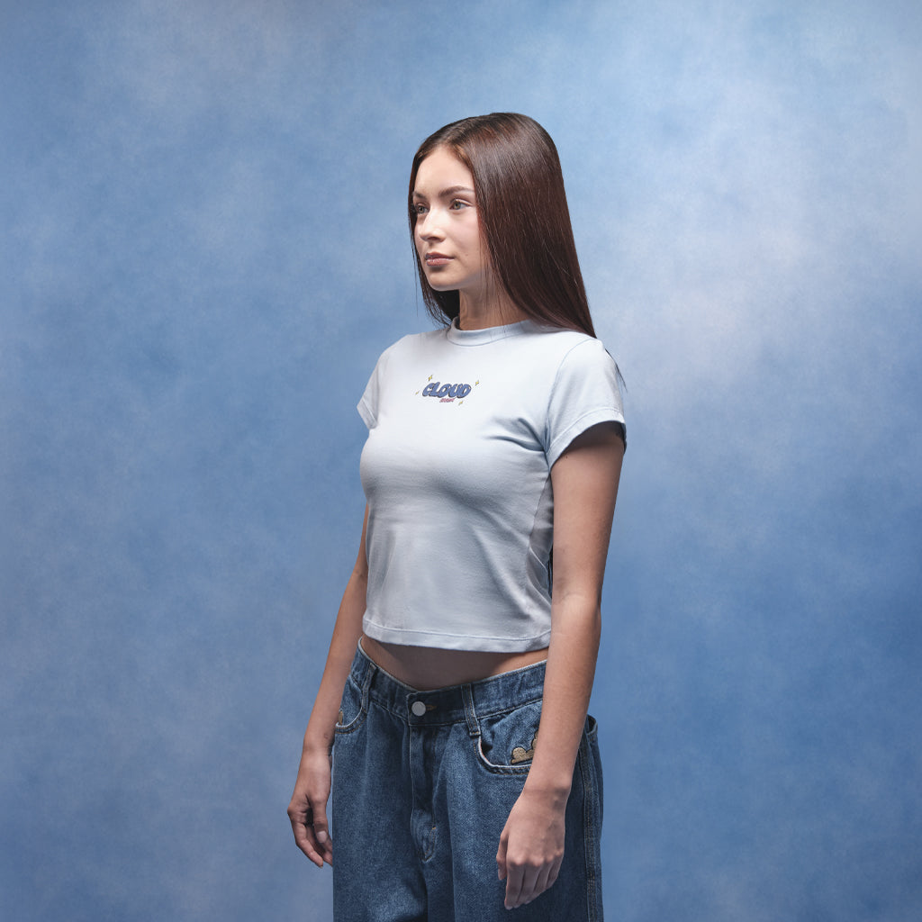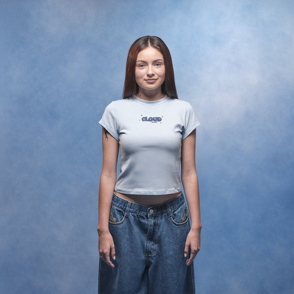 Baby Tee color azul 93% algodón y 7% spandex con diseño de @chuletaprieto.
