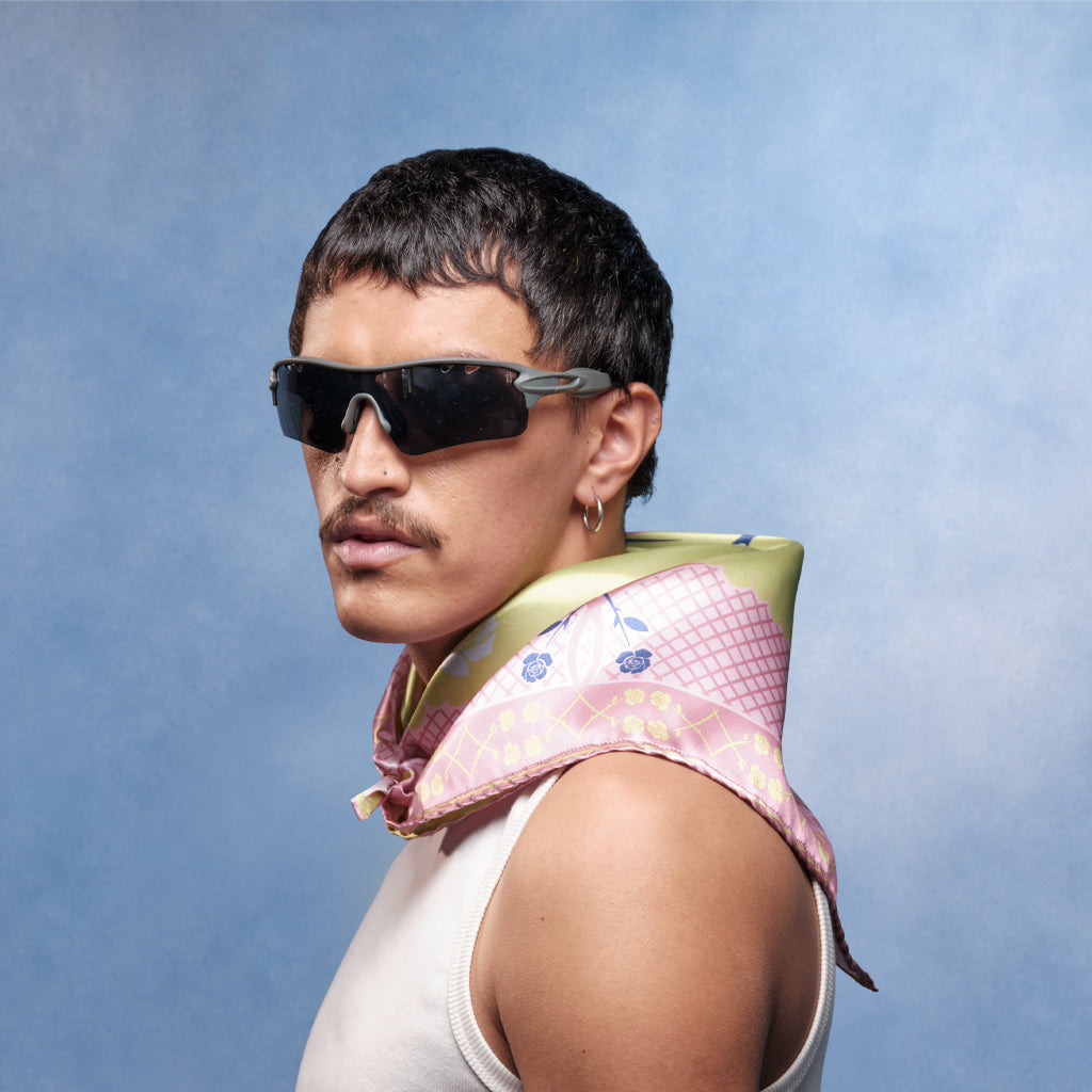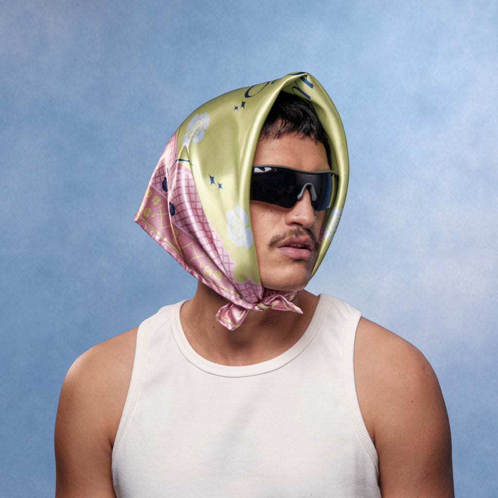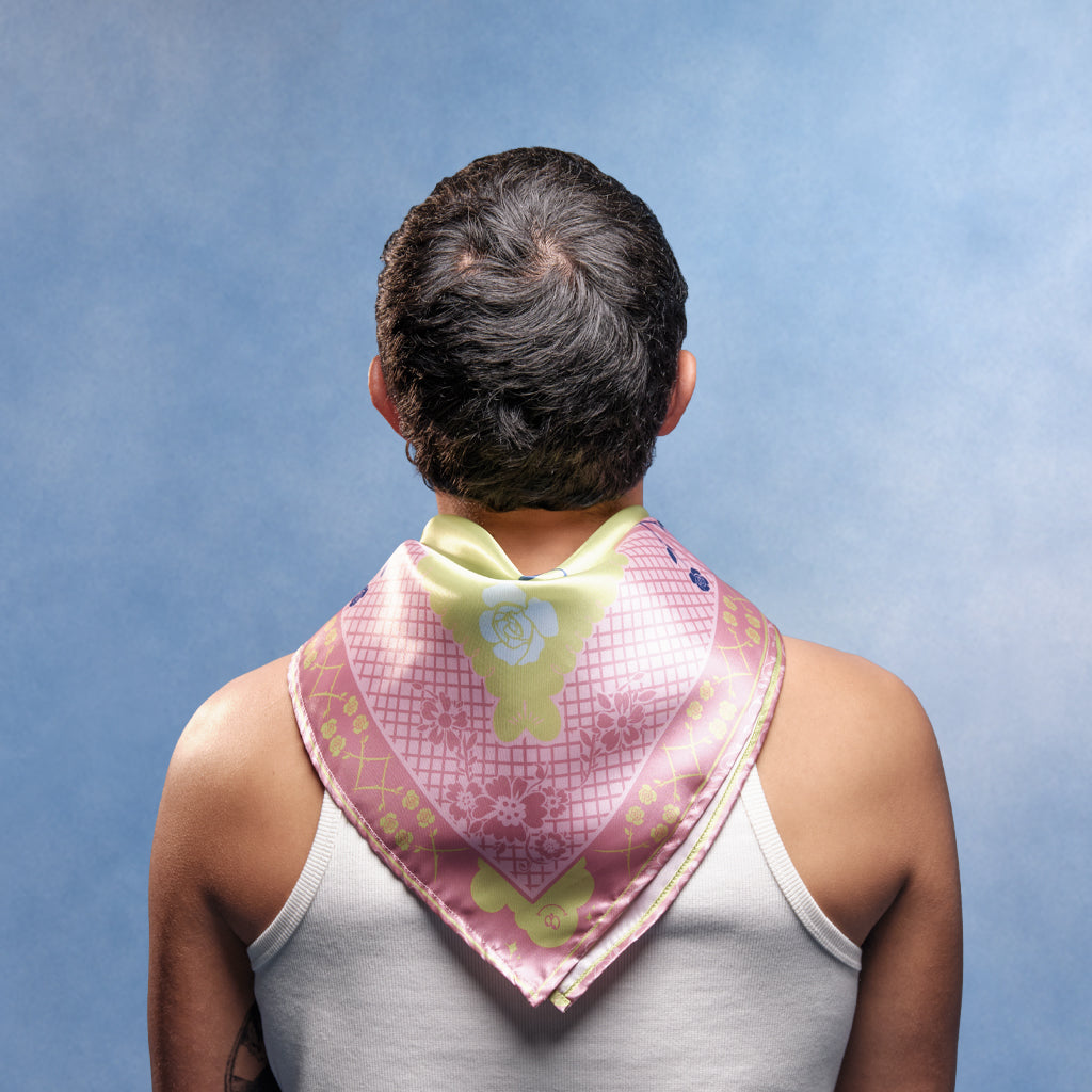 Pañoleta de seda semi-brillante 96% poliestireno y 4% spandex.